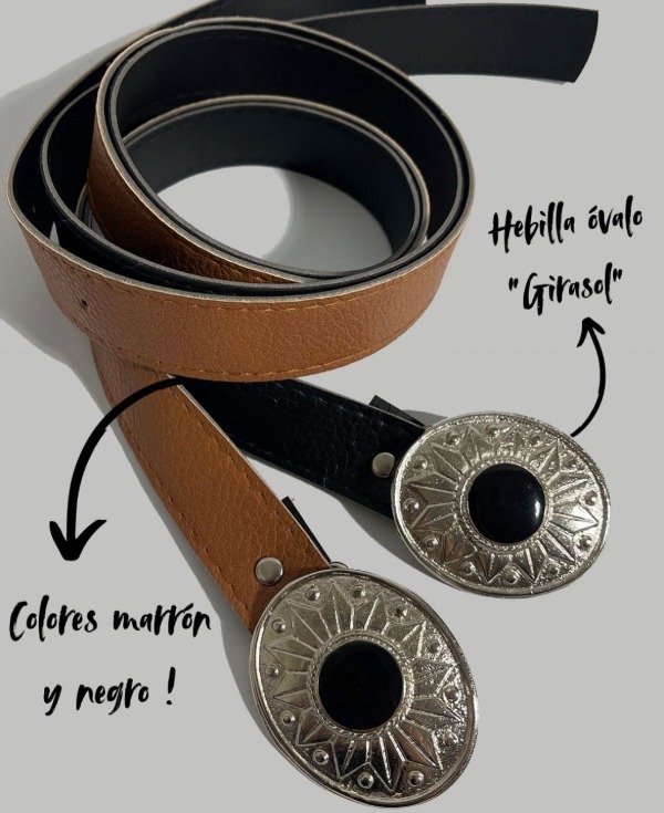 💫 Detalle de hebilla óvalo “Girasol” con diseño trabajado en metal.