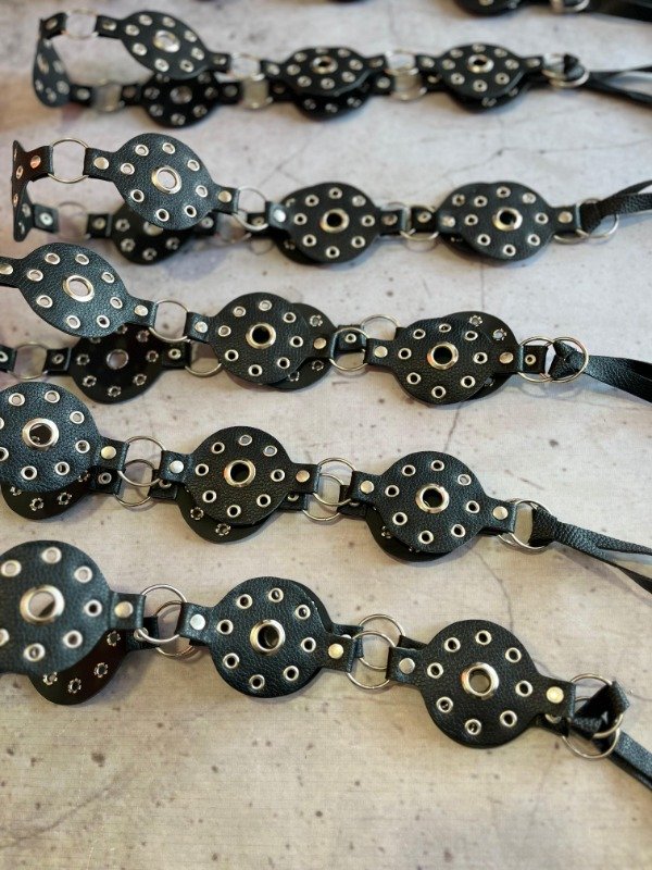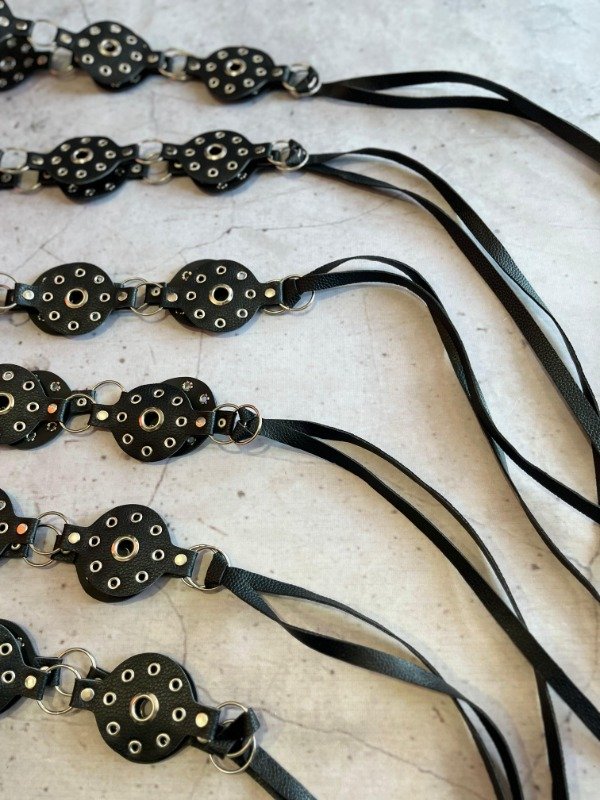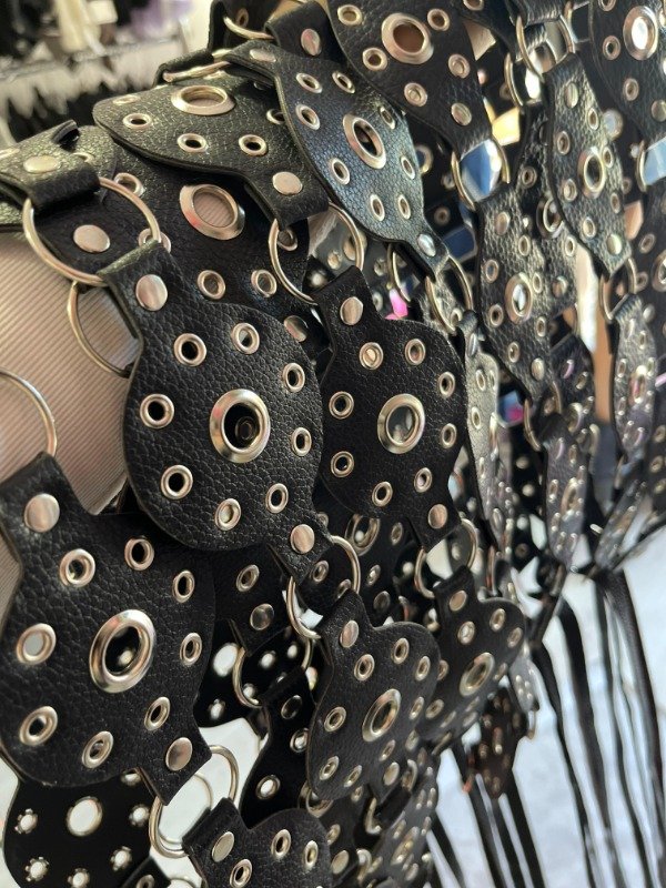 Faja estilo cinturón confeccionada en piezas circulares de eco cuero negro unidas por aros metálicos. Cada círculo está intervenido con tachas y ojales plateados, dándole un look canchero y versátil. Se ajusta con tiras regulables que terminan en moño, ideal para adaptarla a diferentes talles.