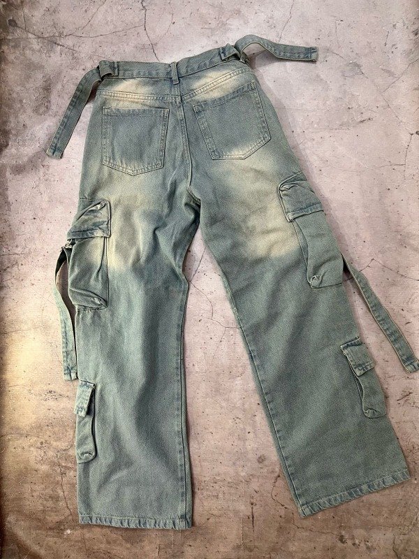 Este pantalón cargo de denim lavado lo tiene todo: estilo, comodidad y detalles que marcan la diferencia. Su diseño holgado, sumado a múltiples bolsillos y tiras ajustables, le da un toque streetwear perfecto para looks urbanos con actitud.