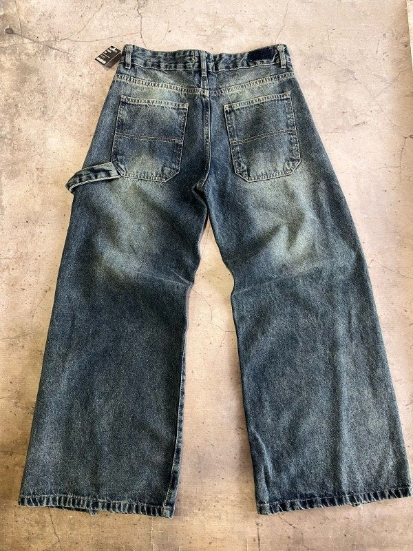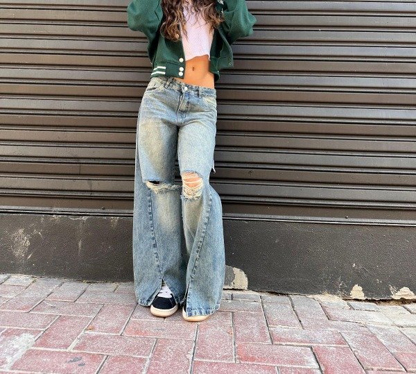 Sumale personalidad a tu look con este jean wide leg en denim azul desgastado. Tiene roturas cancheras en las rodillas, aberturas en los bajos para un fit más relajado y detalle de presilla lateral. Con cintura alta, ajuste con botón y cierre, y presillas para cinturón, es ideal para un outfit urbano con mucha onda.