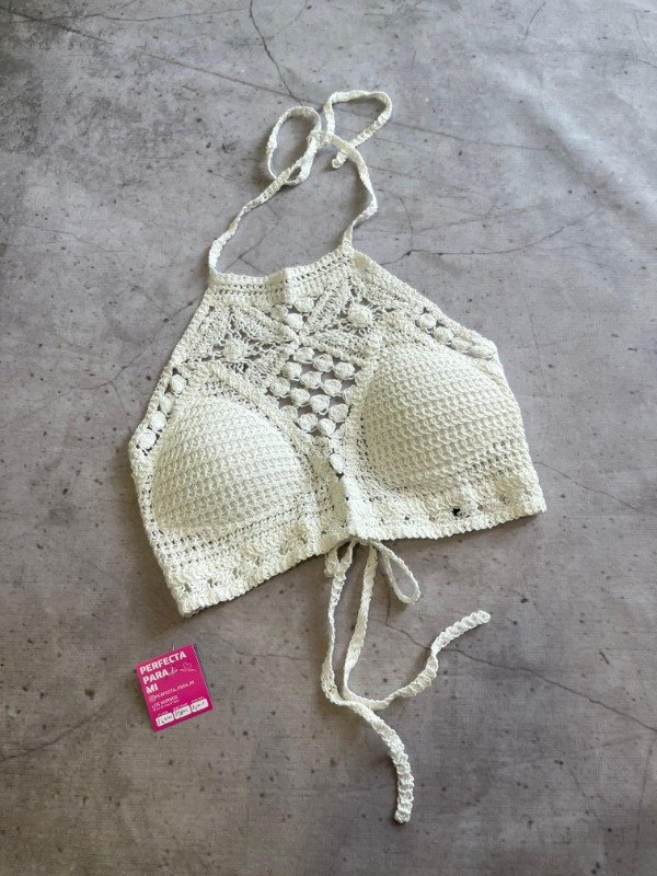 Top estilo boho súper delicado, tejido a crochet con diseño calado y tazas para mejor sostén. Ideal para usar con shorts, jeans o para looks de verano más playeros. Re cómodo y regulable gracias a los lazos. 🤍🌞